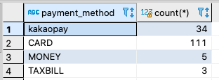 4. select payment_method, count(*): payment_method에 따라 합쳐지 데이터가 각각 몇 개가 합쳐진 것인지 세줍니다.