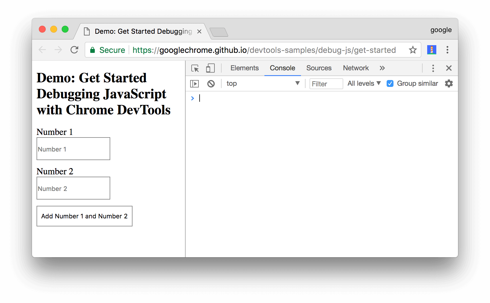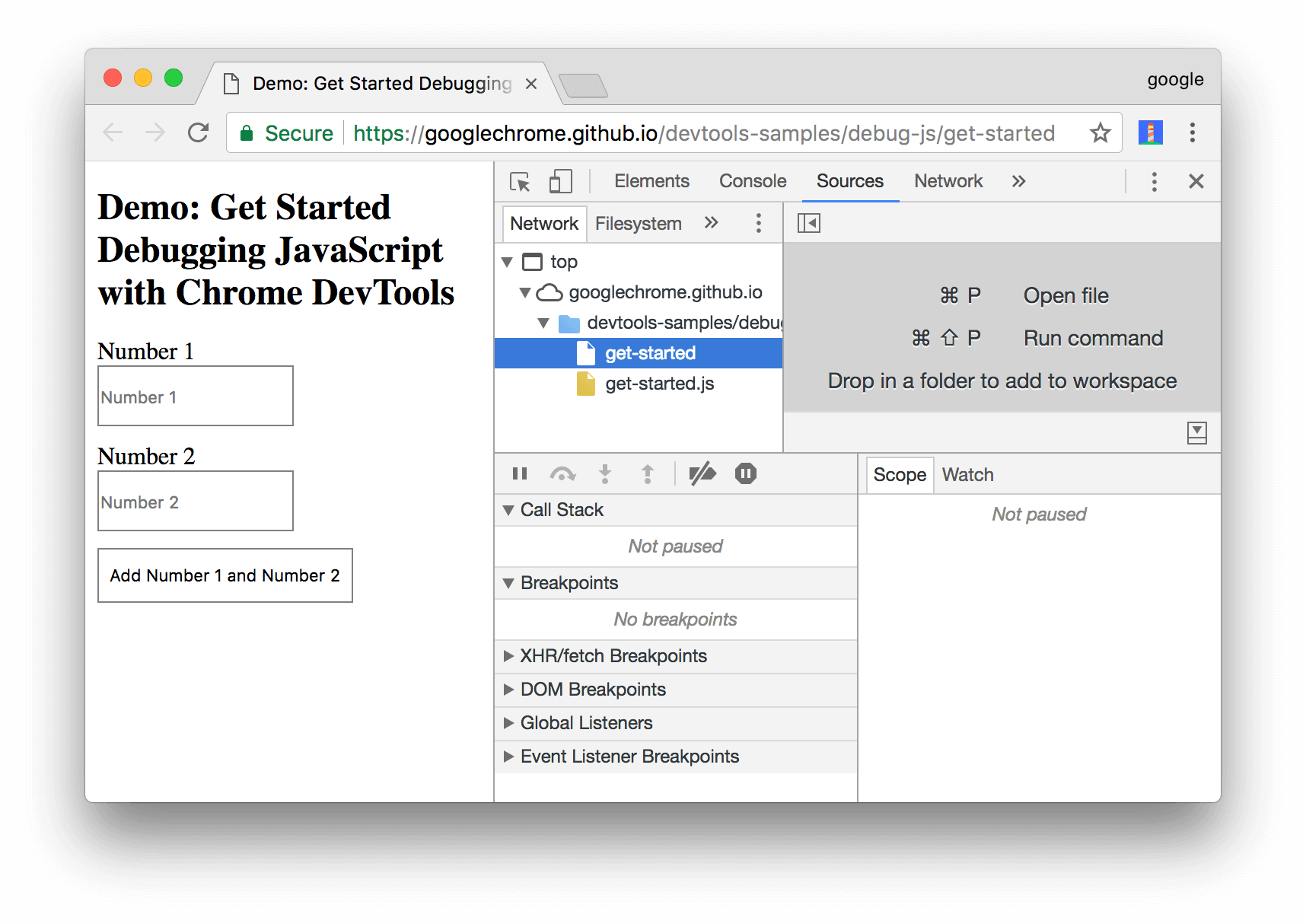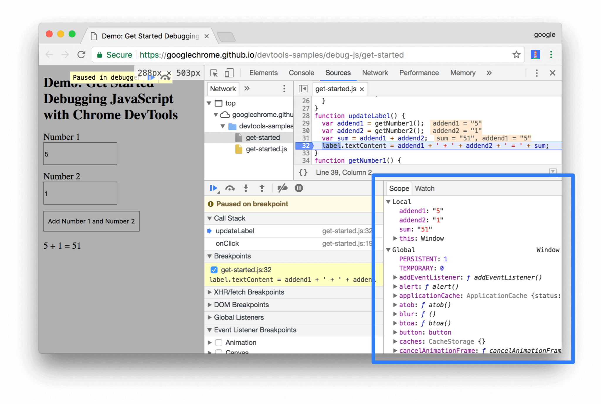 데모로 돌아가 Add Number 1 and Number 2 버튼을 다시 클릭합니다. DevTools가 데모를 일시 중지하고 Source panel 에서 코드 줄을 강조 표시합니다. 다음 코드 라인에서 DevTools를 일시 중지해야 합니다.