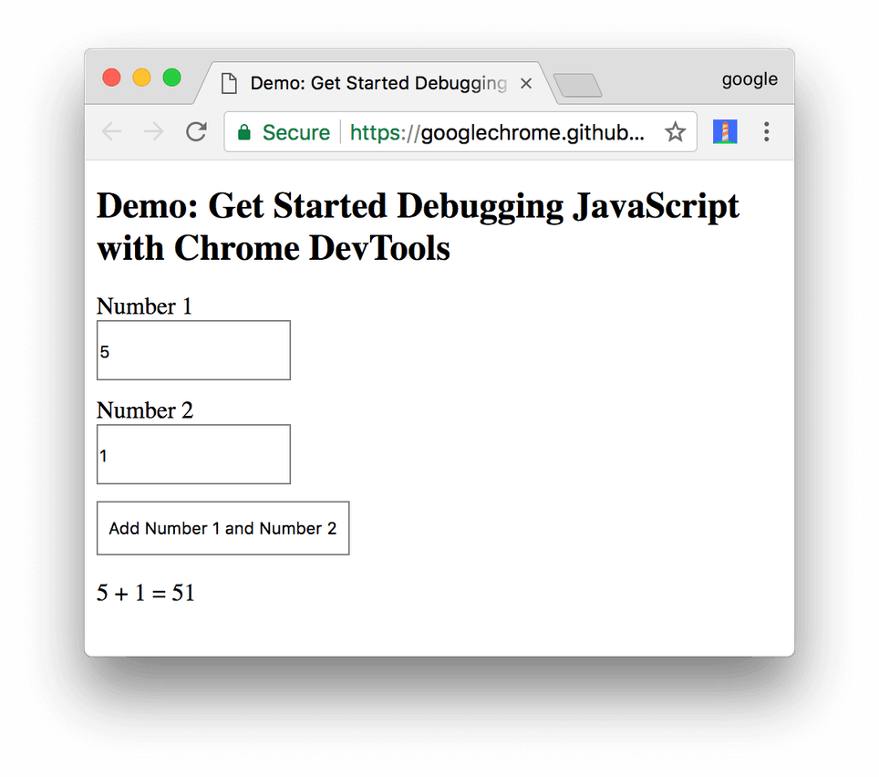 4. Add Number 1 and Number 2 버튼을 클릭하세요. 결과가 6이어야 하지만 51이 나옵니다.