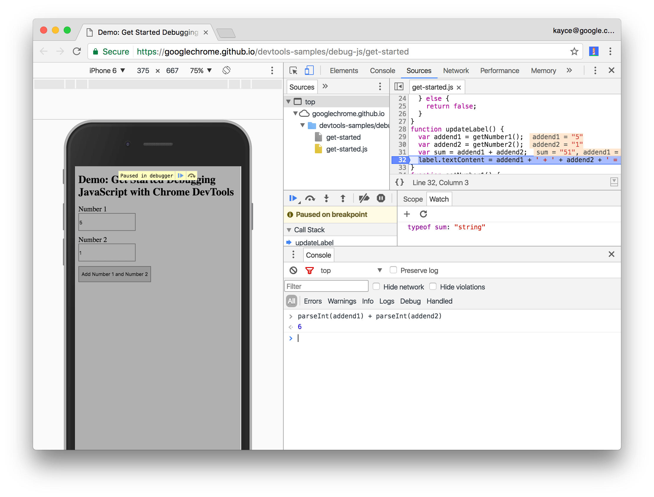 콘솔에서 parseInt(addend1) + parseInt(addend2)를 입력합니다. 이 문은 addition1 및 addend2가 범위 내에 있는 코드 라인에서 일시 중지되어 있기 때문에 작동합니다.