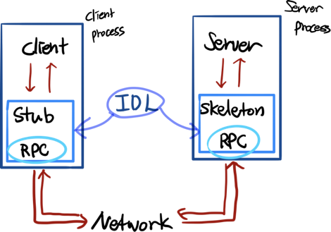 RPC는 일반적으로 , request parameter와 response parameter를 알아야하기 때문에, 양쪽의 인터페이스 규약을 IDL 등의 언어로 정의한 후, 해당 프로그래밍 언어가 부를 수 있는 형태의 코드로 생성을 해줘야하는데, 이를 Skeleton과 Stub코드라고 합니다.